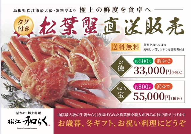 日本料理 松江 和らくの「松葉蟹」をご家庭でもお召し上がりいただけます。